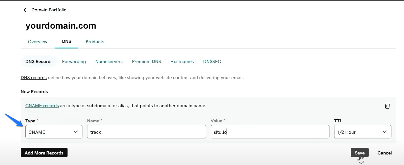 - This time, under record type in the dropdown menu, find CNAME, and paste the details provided in Leadsin’s Custom tracking domain settings.