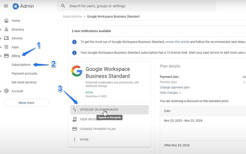 Go to the Main menu and click Billing > Subscriptions in the Admin Console. Then, click on the chosen plan and the Upgrade or Downgrade.
