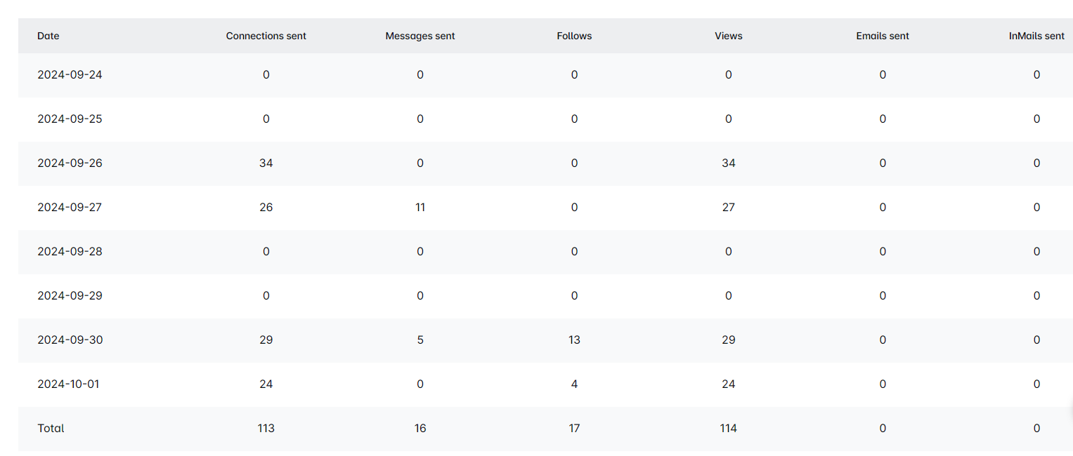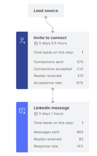 Scroll down for a detailed breakdown of each campaign step. See how many connections were sent, replies received, and emails/messages dispatched by Leadsin. It varies based on your campaign type and the steps included. Easily spot where your leads stand in the campaign.