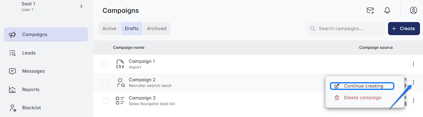 - Ready to jump back in? Simply click on the three dots next to your draft and select 'Continue creating.' But be careful—accidentally hitting the 'delete' option means permanently saying goodbye to your campaign, with no way to recover it. 🚫