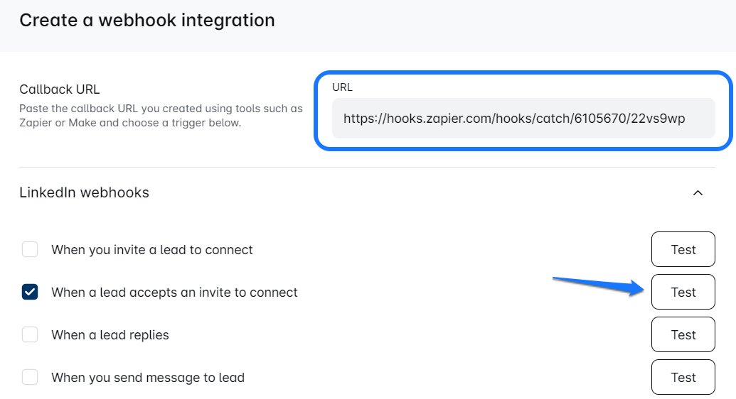 - Go back to the Leadsin and paste the webhook URL into the appropriate field.
