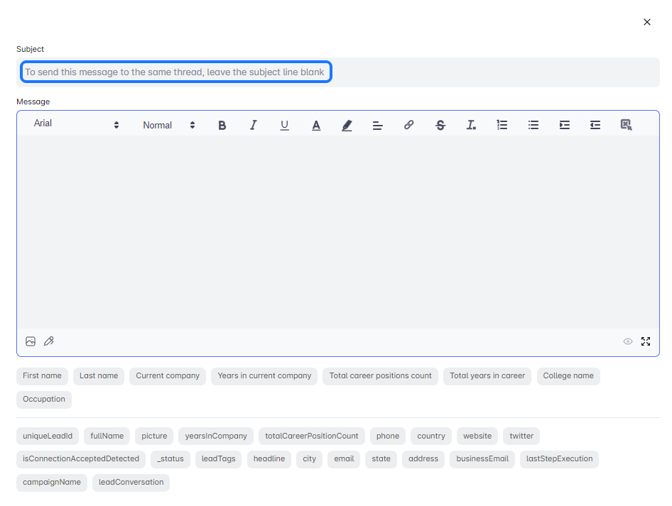 - To continue an email thread after your initial email, just skip adding a subject line in your following emails. By leaving the subject field empty, Leadsin cleverly sends these emails as part of the same thread. Itβs that easy!