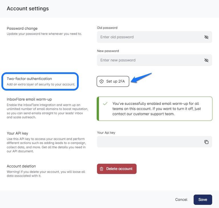 Register and Verify: Complete your Leadsin registration and verify your email address. Once done, a screen will pop up prompting you to activate 2FA.
