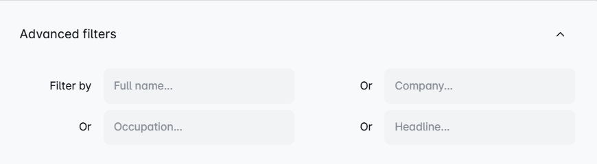 Advanced filters allow you to narrow down contacts based on key profile information. You can filter by: Name, Company, Occupation, Headline