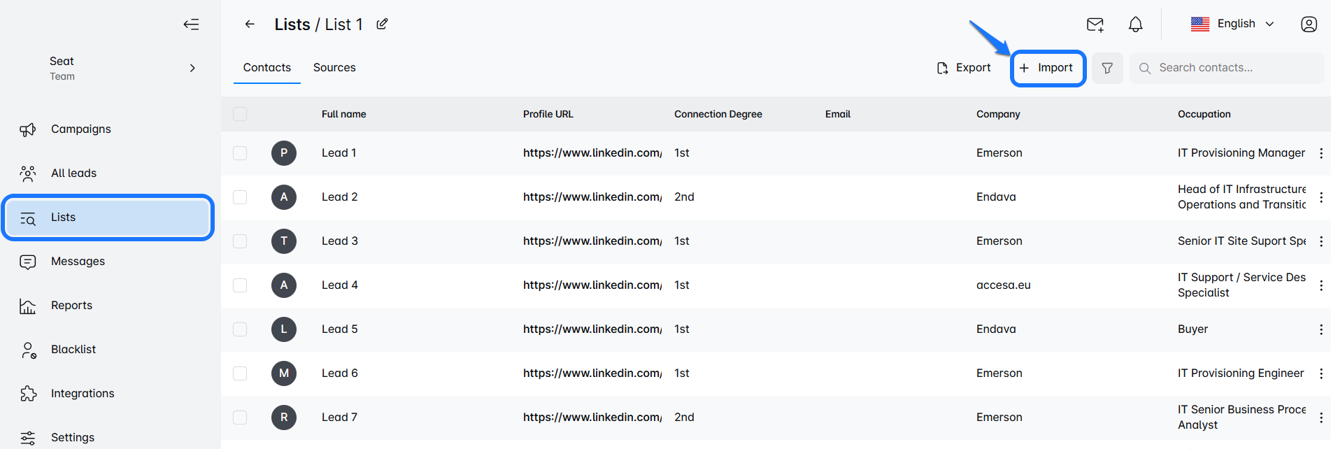 Click on the name of the campaign you want to expand. This will take you to the Leads List page, where you’ll find a shiny button that says “Import” Click it, and upload your CSV file filled with fresh leads, or opt for adding a Search URL.