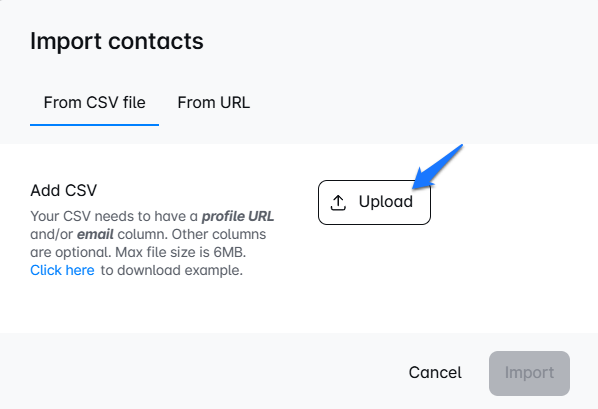 Now click on Upload and import the CSV file. To make sure your CSV file is correctly formatted, you can check our article. Once you added the file, click on Import.