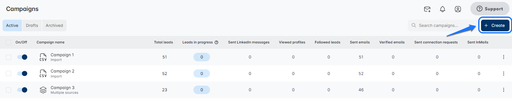 First up, head over to the Campaigns dashboard on Leadsin. Look for the ‘Create’ button in the upper right corner and give it a click. It’s your first step to something great!