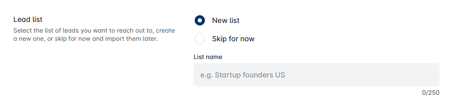 - Choose which Lead List you’d like to use. You can create a new list or skip this step and add a list later.