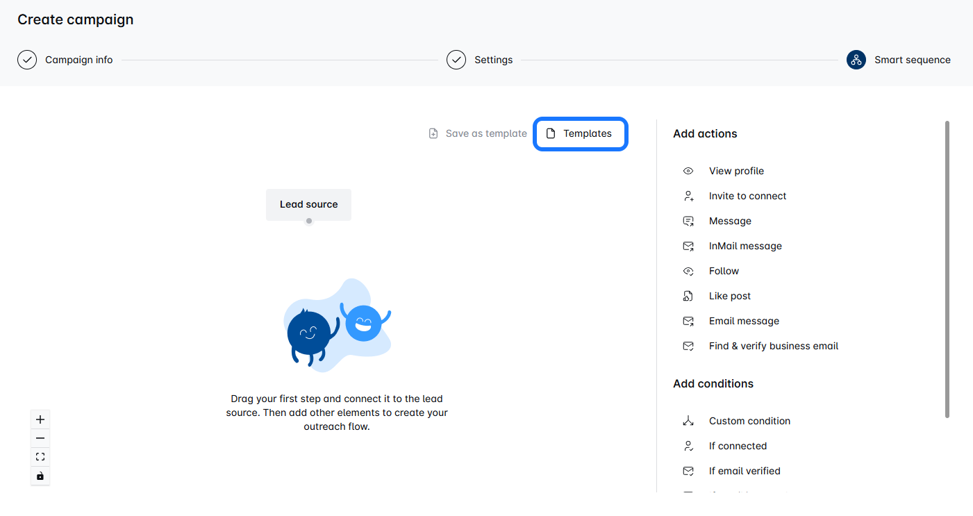 - After configuring your campaign, hit ‘Next’ to reach the sequence builder page. Here’s where the magic happens! You can either pick from Templates or create your own.
